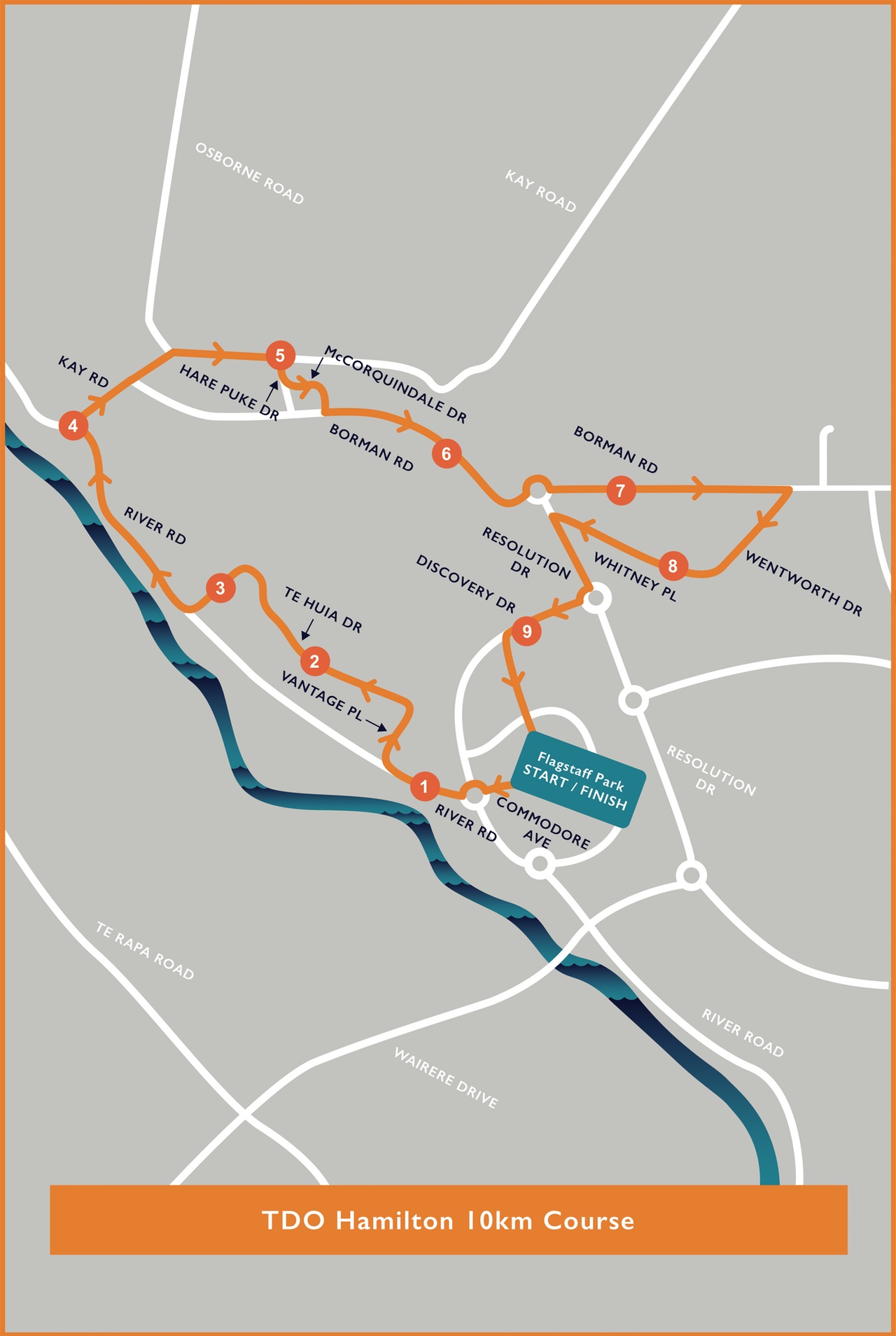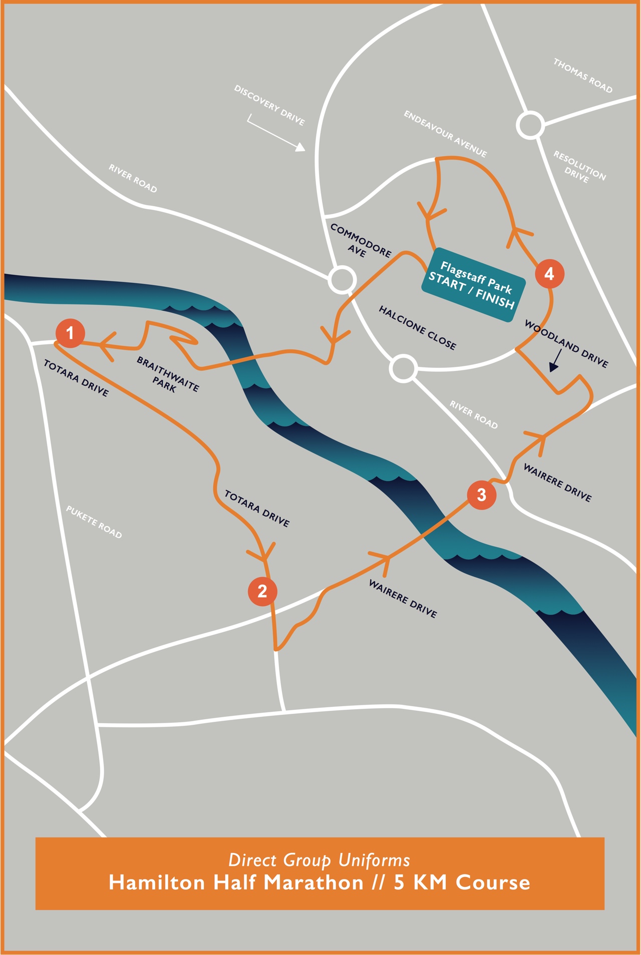 Start in Flagstaff Park on path in Flagstaff Park north of Flagstaff Club; around this path & into Commodore Ave, through roundabout, veer right into River Rd. Continue along River Rd, right into 1st walkway on River Rd and into Vantage Place and then left into Te Huia Drive. Follow Te Huia Drive to River Rd. Right into River Rd and continue north along River Rd to Horotiu Rd. Left into Horotiu Rd and left onto Te Awa river trail. Follow trail and exit into Meadow View Rd, left into Pukete Road, left off Pukete Rd to follow river trail to exit again out onto Pukete Rd to Totara Drive. Left into Totara Drive, cross bridge and left into pathway that leads onto Wairere Drive. Continue along Wairere Drive, cross Pukete Bridge, through underpass at Wairere Drive/River Rd, straight ahead on path and continue along this path to the next underpass on Wairere Drive. Left into this underpass, this brings you out onto Resolution Drive. Continue along Resolution Drive on path to next underpass. Right into this underpass and left into Wentworth Drive. Follow Wentworth Drive and left into Whitney Place to underpass at Borman/Resolution Drive. Left into underpass and then sharp left and right onto Resolution Drive. Continue along Resolution Drive and right into Discovery Drive. Approximately 200m along Discovery Drive cross to the other side, continue along Discovery Drive and then turn left into Discovery Park. Continue straight ahead and cross Endeavour Ave & into Flagstaff Park to the finish. The finish is in the centre of the field opposite Flagstaff Club.